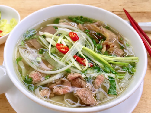 Nouilles de riz, viande de boeuf coupée en fines tranches, pousses de soja, feuilles de menthe, ciboulettes, oignons, bouillon de boeuf.